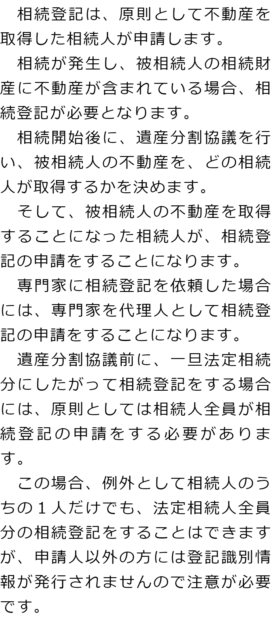 相続登記を申請する人についてのQ&AQ相続登記は誰が申請するのですか?Q相続登記を申請するまでの流れについて教えてください Q相続登記は誰が申請するのですか?AQ相続登記を申請するまでの流れについて教えてくださいA お役立ち情報・Q&A(目次)お役立ち情報・Q&Aトップお役立ち情報相続登記の手続きの流れ相続登記は誰が申請するのかQ&A相続登記を申請する人についてのQ&A相続登記の登録免許税に関するQ&A 受付時間 平日 9時~21時、土日祝 9時~18時 夜間・土日祝の相談も対応します (要予約) 所在地 〒277-0005 千葉県柏市柏4-2-1メットライフ柏ビル3F 0120-41-2403 お問合せ・アクセス・地図